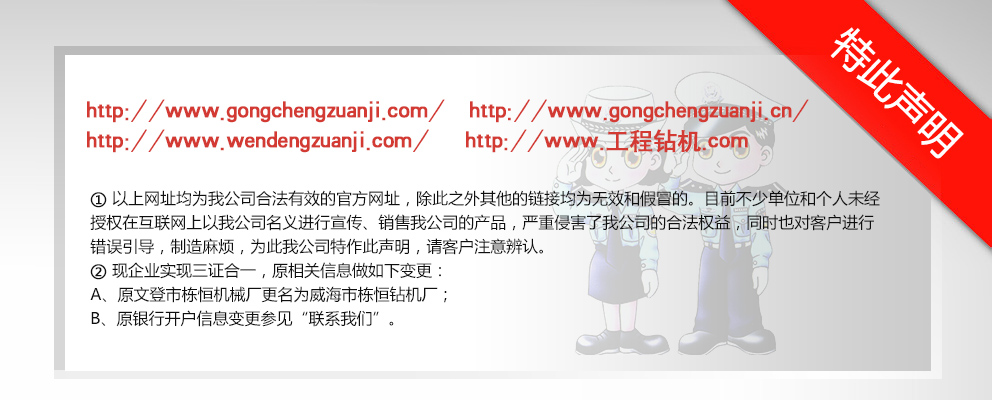 威海市棟恒鉆機廠隸屬于文登市工程鉆機廠,主要生產、銷售工程鉆機。它坐落于文登市西鋪頭工業(yè)園,這里科技發(fā)達,交通便利,制造業(yè)集中。 自1982年建廠以來,經過多年的優(yōu)化改革和沉淀積累,擁有精密、大型加工設備近百臺的生產企業(yè)之一。現(xiàn)在研制成功的GJ-400、GJ-250S、GJ-250A、GJ-240S、GJ-240A、GJ-180S、GJ-180A型等鉆機。在其它產品上,企業(yè)建立了長期、中期、短期的發(fā)展規(guī)劃,一系列的高性能產品正在不斷推出中,企業(yè)應市場需求對系列產品進行了優(yōu)化組合,開發(fā)了與之對應配套的三腿、四腿單天車輪、雙天車輪鉆塔;泥漿泵—BW-160Q、BW- 200Q型球形閥泥漿泵大大提高了泵的使用性能和機械效率